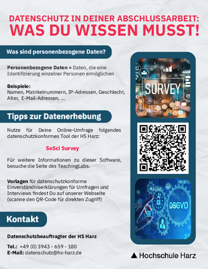 Die Studierenden der Hochschule Harz haben die Möglichkeit, auf die Plattform SoSci Survey zuzugreifen. Diese Plattform speichert und verarbeitet alle gesammelten Daten im Einklang mit der DSGVO, was sie sicherer macht als viele frei zugängliche Tools im Internet. Nutzen Sie SoSci Survey, um Ihre Umfragen professionell und sicher zu gestalten. Weitere Informationen zu dieser Software sind auf der Webseite des TeachingLabs zu finden (https://www.hs-harz.de/teachinglab/software-forschung-und-lehre).