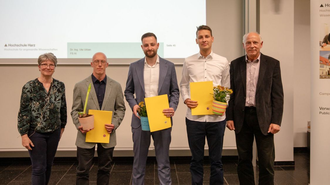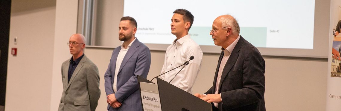 Im November wurden drei Alumni der Hochschule Harz mit dem Solarpreis 2025 des HS Harz Solar e.V. ausgezeichnet. Prämiert wurden mit Nick Schünemann, Phillip Riehl und Arbenit Kokollari drei Alumni der Fachbereiche Automatisierung und Informatik sowie Wirtschaftswissenschaften. Der Preis ehrt Bachelor- und Masterarbeiten im Bereich des Klimaschutzes, insbesondere der erneuerbaren Energien, und ist mit je 250 Euro dotiert. Prof. Dr.-Ing. Ute Urban und Prof. Volker Ruwisch vom HS Harz Solar e.V. überreichten die Auszeichnung im Rahmen der GenerationenHochschule zum Thema „Zukunft Harz: Klimaschutz und -anpassung generationenübergreifend denken“.