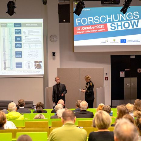 Nahbar, eindrucksvoll und interaktiv - bei der Forschungsshow 2025 der Hochschule Harz werden wissenschaftliche Themen aus dem Hochschulkosmos publikumswirksam präsentiert. Dabei reicht das Spektrum von Aktivitäten für den Klimaschutz über Unterstützungsfragen für Ehrenamtliche im ländlichen Raum bis hin zu digitalen Lösungen für eine papierreduzierte Zukunft. Zudem bietet das Rahmenprogramm reichlich Gelegenheit, Forschung hautnah zu erleben sowie miteinander ins Gespräch zu kommen. Die Veranstaltung wird organisiert vom Harzer Team des Kompetenznetzwerks für Angewandte und Transferorientierte Forschung (KAT), das vom Land Sachsen-Anhalt und der Europäische Union finanziert wird.