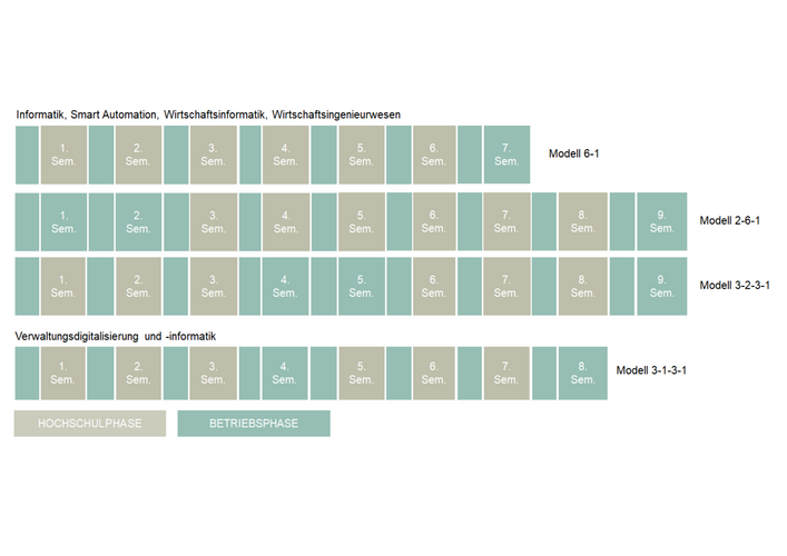 Studierende der dualen Studienvarianten am Fachbereich Automatisierung und Informatik können in Abstimmung mit dem Vertragspartner zwischen drei Modellen des Studienablaufs wählen. Bei allen Modellen verbringen sie das letzte Studiensemester im Unternehmen, um auf Grundlage eines Praxisprojekts die Bachelorarbeit zu verfassen.