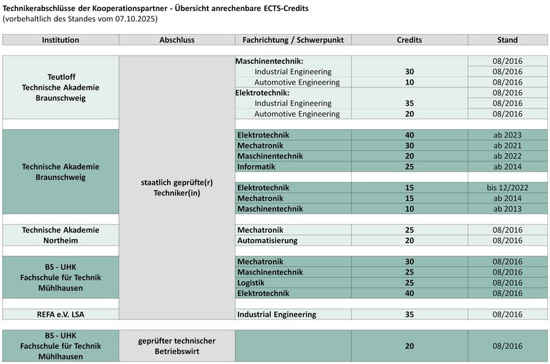 Leistungen aus Fort- und Weiterbildungsqualifikationen zum staatlich geprüften Techniker unserer Kooperationspartner können pauschal angerechnet werden. Leistungen aus deutschlandweit einheitlich geregelten Fort- und Weiterbildungsqualifikationen von IHK-Institutionen können ebenfalls pauschal – das heißt ohne Einzelfallprüfung – angerechnet werden.