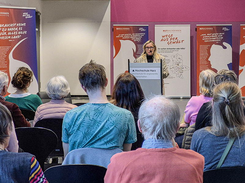 Gewalt gegen Frauen kann unterschiedliche Erscheinungsformen haben – zuhause, am Arbeitsplatz, im öffentlichen Raum und im Internet. Die Ausstellung macht deutlich: Gewalt beginnt nicht erst mit körperlichen Übergriffen, sondern oft bereits mit Bedrohungen, Beschimpfungen, Kontrolle und Entwürdigung. Für Betroffene ist es häufig sehr schwer, sich aus der Gewalt zu lösen. Ein entscheidender erster Schritt kann sein, sich jemandem anzuvertrauen, Scham- und Schuldgefühle zurückzulassen und Rat sowie Unterstützung anzunehmen. In Sachsen-Anhalt steht dafür ein engagiertes Hilfenetzwerk zur Verfügung: Frauen und ihre Kinder erhalten kostenfrei, vertraulich und auf Wunsch anonym Hilfe. „Zugleich richtet die Ausstellung einen klaren Appell an die Gesellschaft: Ob in der Nachbarschaft, im Kollegium oder im Freundeskreis – wir alle sind gefordert, hinzusehen und einzuschreiten, wenn erste Anzeichen von Gewalt erkennbar werden. Es gibt Auswege – es braucht Mut und Ermutigung, diese zu gehen“, betont Stefanie Krebs vom Gleichstellungsteam der Hochschule Harz.