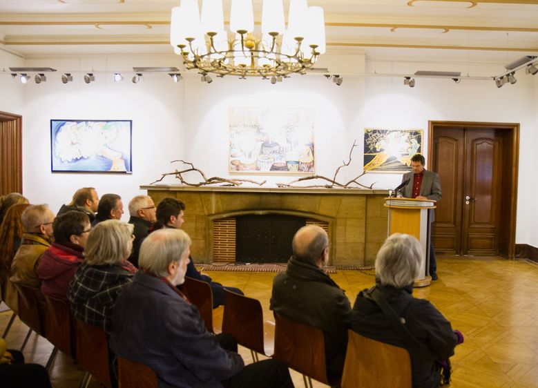 Barbara Carius absolvierte ihr Kunstdiplom an der neuen Kunstschule Zürich, denn es reichte ihr nicht, „nur den Drang zu verspüren, anderen etwas Kunstvolles mitteilen zu wollen, es bedarf dazu auch einer ausgefeilten Technik“, so Professor Scheruhn in seiner Laudatio. Die ausdrucksvollen Motive der Kunststücke, wie sie Barbara Carius selbst nennt, lassen Spielraum zur Interpretation, auch wenngleich die teils an die Schöpfungsgeschichte erinnernden Titel wie „Annäherung an Eden“ und „Baum der Erkenntnis“ richtungsweisend sind. „Richtige Kunst ist religiös“, zitierte Prof. Dr. Hans-Jürgen Scheruhn die 78-jährige Malerin. Sie hat bereits in vielen Kirchen verschiedener europäischer Staaten, aber auch in weltlichen Gebäuden, wie dem Europa-Parlament in Straßburg, ausgestellt. „Das Zusammenwirken ihrer Gemälde mit den Räumlichkeiten der altehrwürdigen Rektoratsvilla hat ihr besonders gefallen“, verriet Prof. Dr. Hans-Jürgen Scheruhn abschließend und bezeichnete die Ausstellung passenderweise als Gesamtkunstwerk.